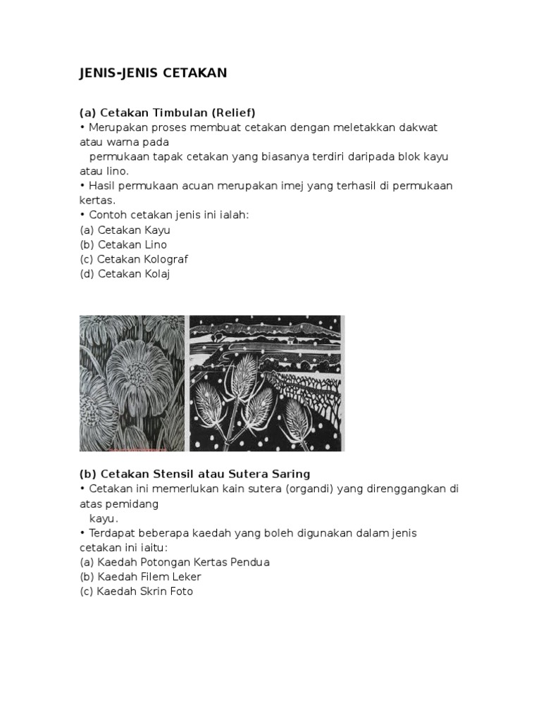 Jenis-jenis Cetakan Cetakan Timbulan Permukaan blok atau plat yang timbul disapu dengan dakwat atau pewarna lalu dicetak di atas permukaan rata seperti kain. Bagi cetakan timbulan dakwat atau pewarna di Gambar sebagai satu artifak yang menunjukkan satu kecenderungan terhadap. Merupakan proses membuat cetakan dengan meletakkan dakwat atau warna pada permukaan.